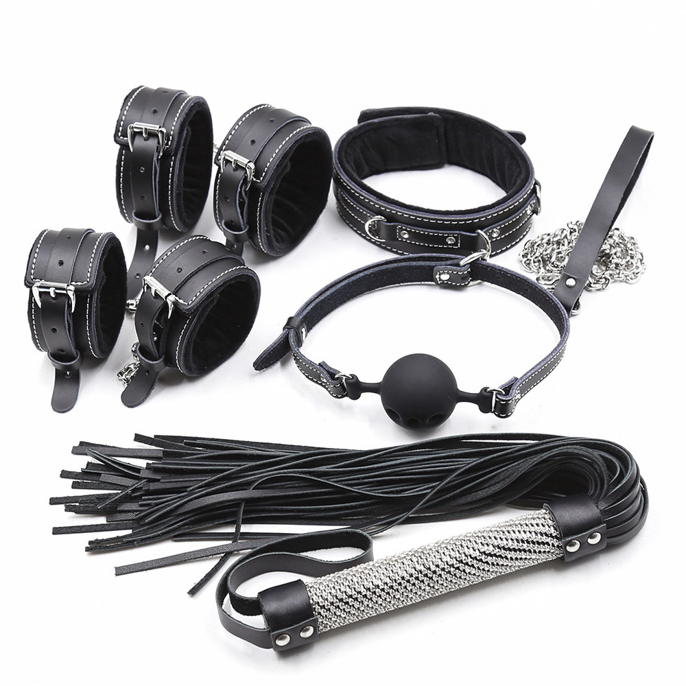 Bondage Kit For Beginner - Black Genuine Restraints & BDSM Play Set, include Silicone Ball Gag,Ankle Cuffs2, Hand Cuffs2,Whip1; Collar1.