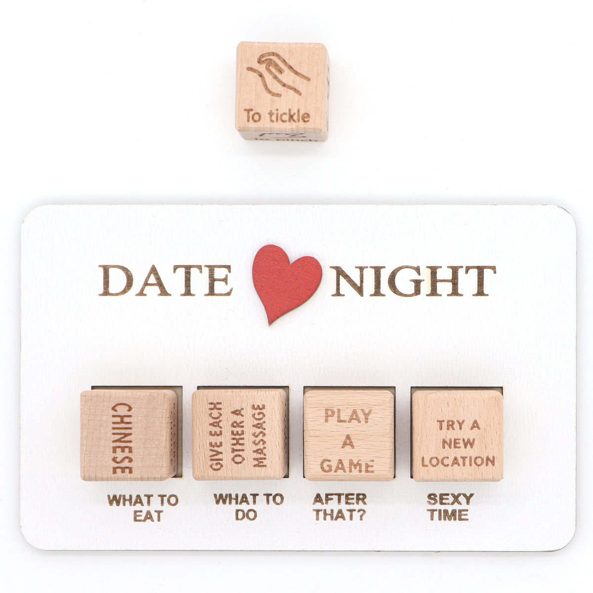The set typically includes several wooden dice with different options, such as where to eat, what activities to do, and more intimate suggestions.