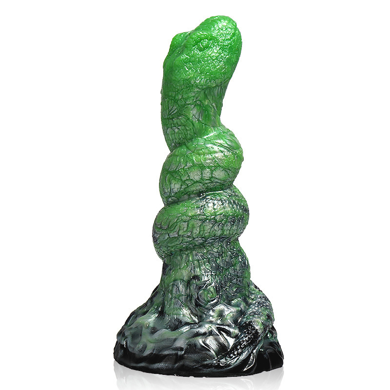 Featuring a bold black and green color scheme, this dildo boasts a captivating snake-like design that twists and winds for an exotic appeal. The intricate snake scale texture adds a wild allure, providing intense stimulation. Each detail is crafted to enhance your pleasure, making this dildo a striking choice for those who seek both visual and tactile excitement.