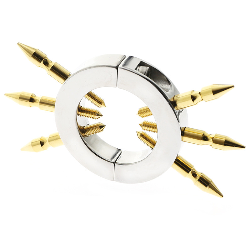 Stainless Steel Ball Stretcher with studs and spikes inside and outside, when the spikes are turned they screw into the centre in a vice like manner (for extra stimulation). The ball stretcher splits in to 2 halves with an allen key, so it's easy to fix around the scrotum. WARNING - this isn't for the faint hearted, but for guys who know how they want to get off look no further. Get hard, get in, get off! WE LOVE IT!