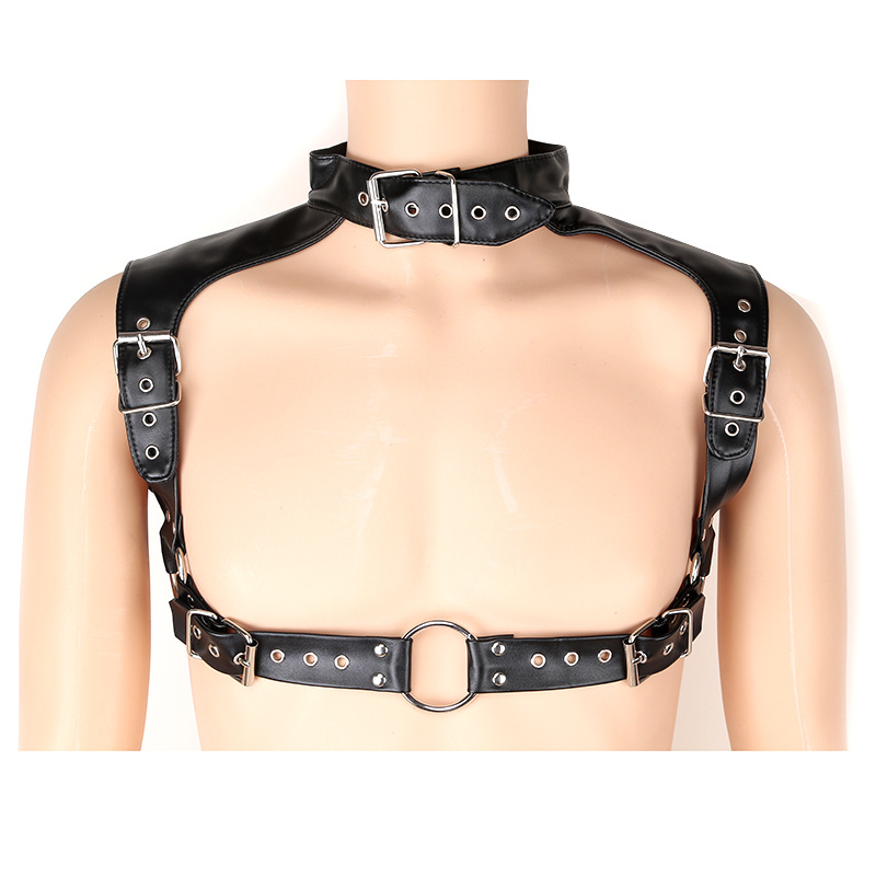 Features adjustable chrome silver buckles at the neck, shoulders, chest and torso