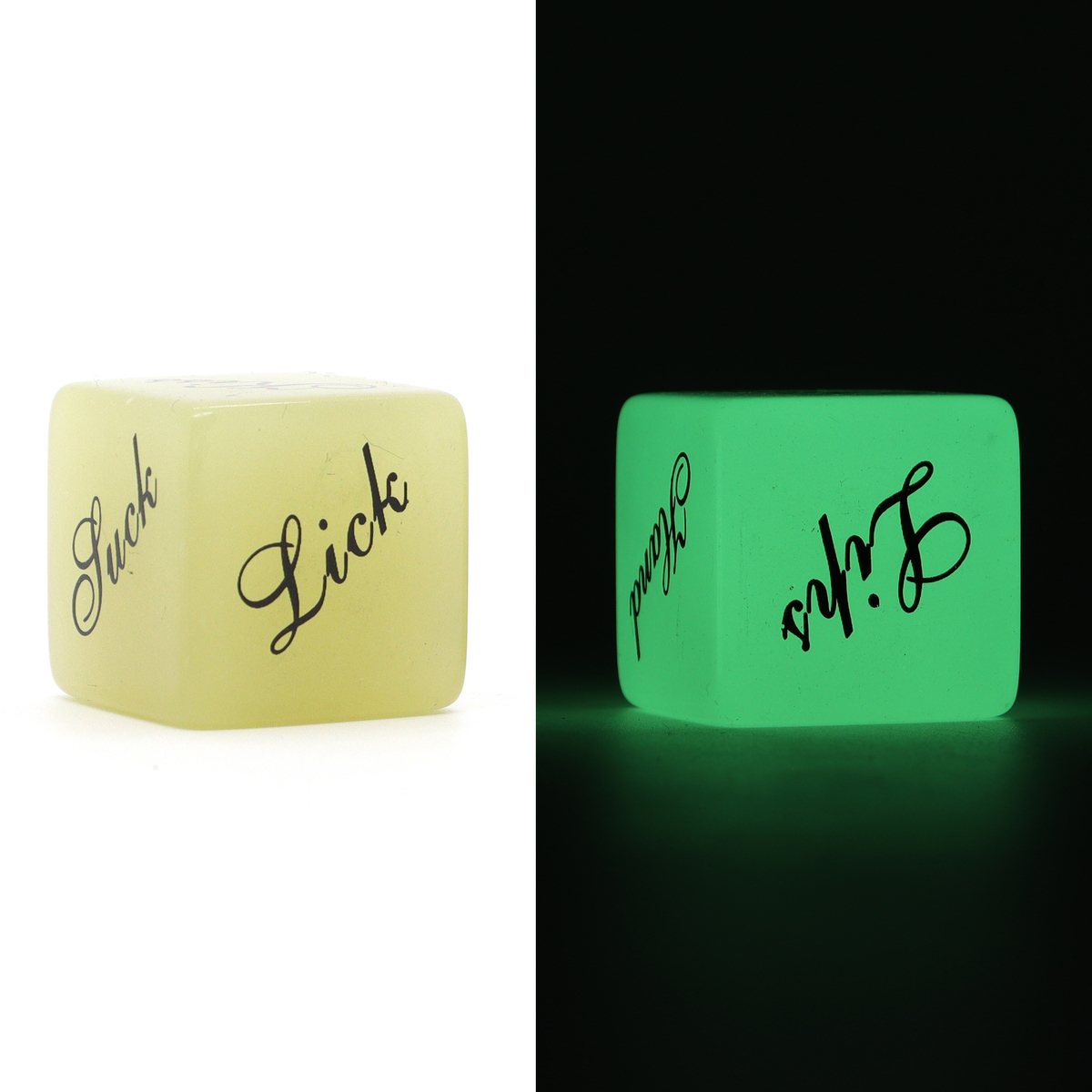 A pair glow foreplay dices consist of two dices, one with body parts and the other with activities; A roll of the dice will determine which action is to be applied to which body part. This challenging game will break the ice, heighten the sexual atmosphere and promote foreplay.