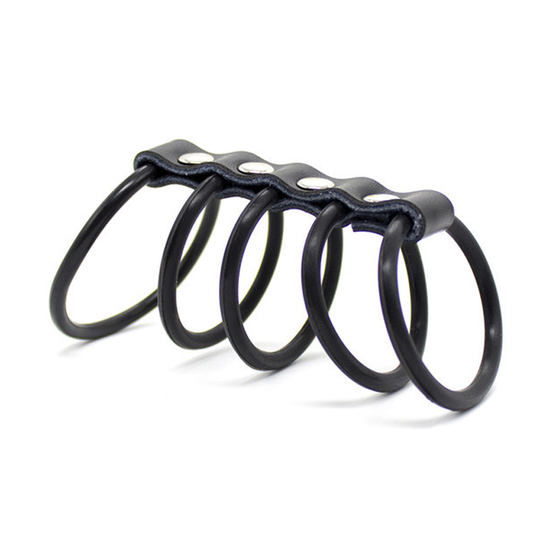 These Rubber Gates of Hell consist of a series of heavy duty rubber rings connected by a leather strap. The largest ring goes over the balls and cock, while the cock alone goes into the other rings.