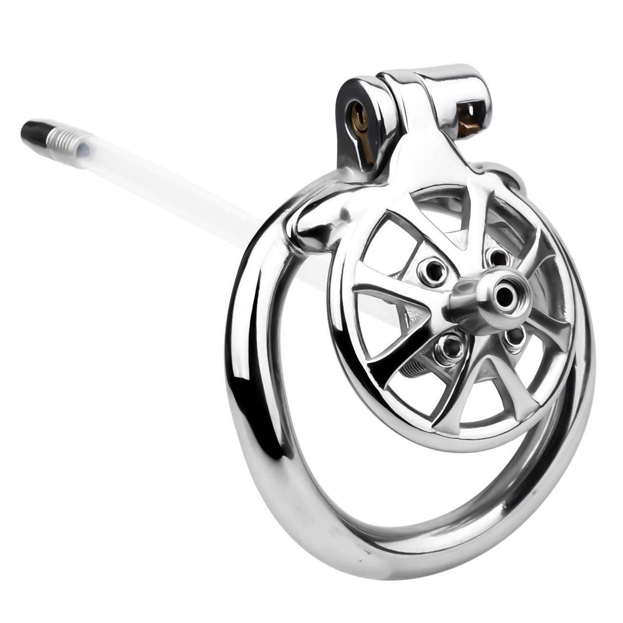 This male Spike Chastity Cage With Silicone Urethral Catheter is made of 304 stainless steel, which is safe, non-toxic, rust-resistant and can be worn for a long time. The design is inspired by wheels and comes with 4 rivets to stimulate your glans. The length can be adjusted according to personal needs, and the round hole in the middle can be used with a catheter.