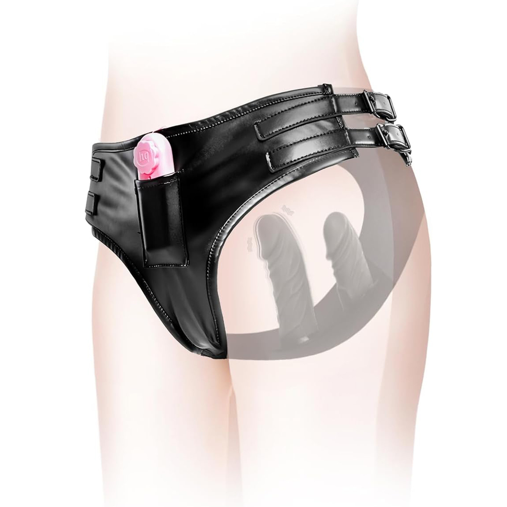Completely made of patent leather rubber for a seamless, skin-safe fit, and extremely easy care. High waist patent leather pants with hidden realistic dildo for discrete pleasure while wearing, comfortable to wear.
